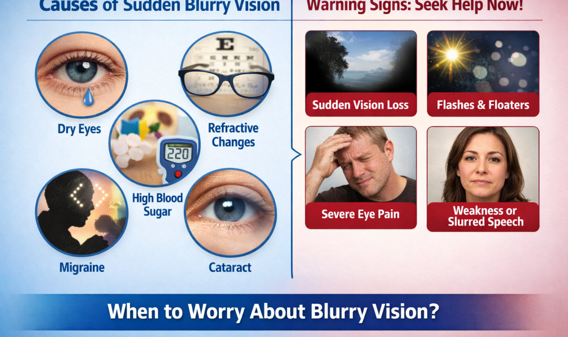 Sudden blurry vision can happen due to dry eye, refractive changes, migraines, blood sugar fluctuations, retinal problems, or even stroke. Some causes are temporary and harmless. Others require urgent medical care. The key is recognizing red-flag symptoms.